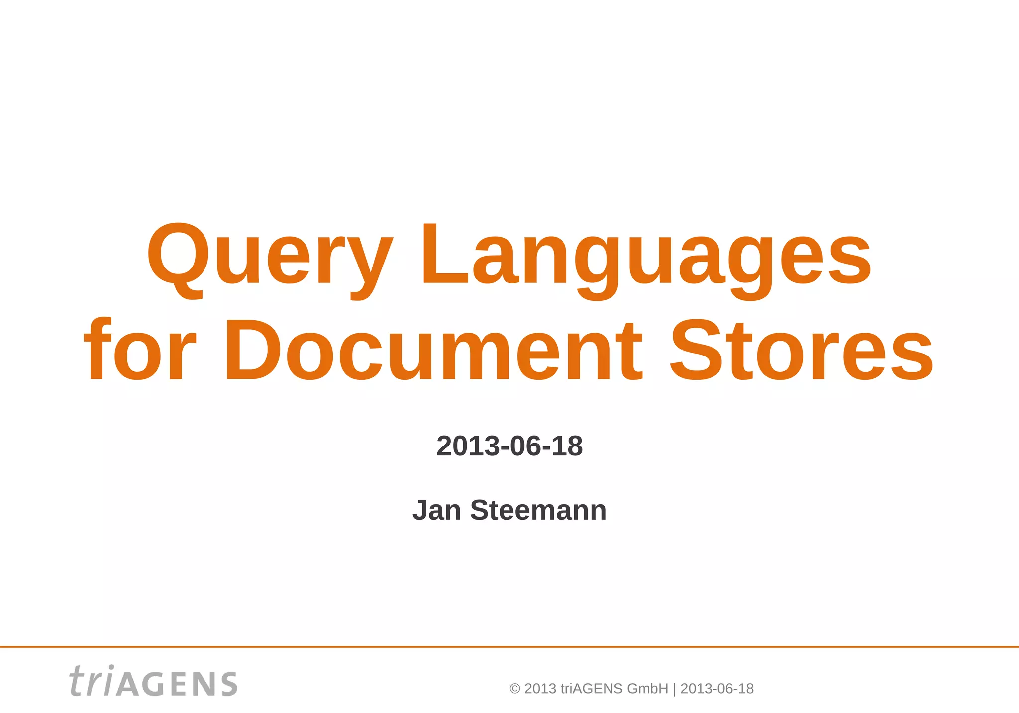 The document discusses query languages for document stores. It notes that while document stores today provide different proprietary querying mechanisms, there is no standard query language like SQL for relational databases. It presents ArangoDB's AQL and JSONiq as two query languages designed for querying JSON documents that support features like joins and aggregation. The document encourages trying these languages and providing feedback to help advance querying in document stores.