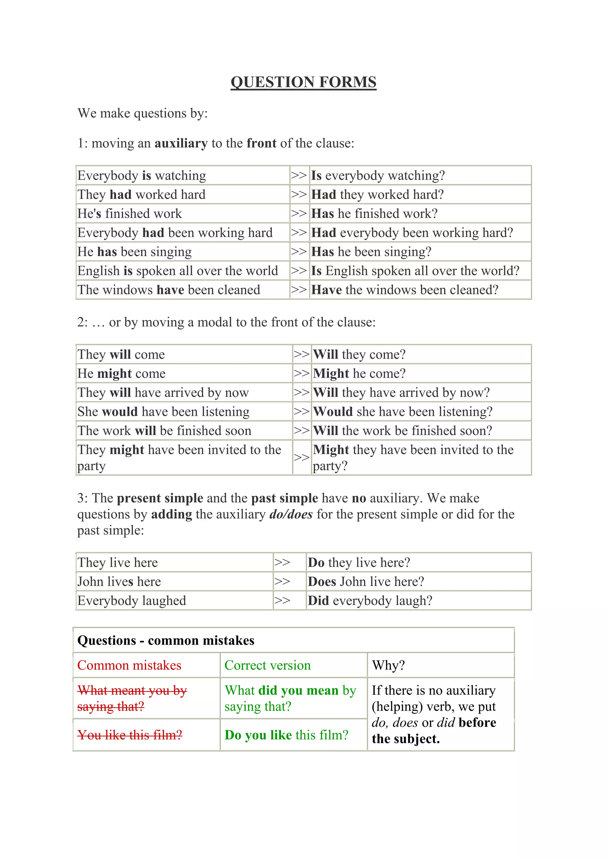 The document discusses how to form questions in English by moving auxiliaries like "is", "are", "have", "will", etc. to the front of clauses or by adding "do/does/did" when there is no auxiliary. It also provides examples of common mistakes in question formation and the correct versions. At the end, it lists 14 sets of sentences and questions based on a short text about a person named Frank.