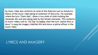 This document discusses theorists and their notions of lyrics, imagery, and visuals related to looking and genre characteristics. It raises a question about theorists and explores lyrics, imagery, the notion of looking, and visual and genre characteristics.