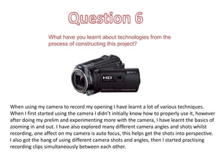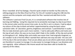 When constructing this project, the author learned several techniques for using a camera including zooming, different camera angles and shots, and auto focus. They also learned how to transfer footage to Final Cut Pro editing software. Final Cut Pro allowed the author to rearrange and edit clips, add audio effects, titles and color corrections to create their dream-like film. Additionally, the author used online presentation tools like Blogger, Slideshare, Prezi and Emaze to host and embed their coursework in engaging formats.