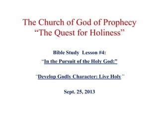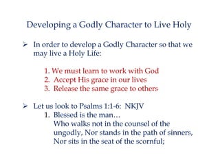 This document is from a Bible study lesson on developing a godly character to live a holy life. It discusses avoiding evil influences, allowing God to reshape one's heart, and growing Christian virtues like faith, goodness, knowledge, and love. The key point is that holiness is a continuous journey that requires daily growth in becoming more like God, not a finish line. One must constantly pursue maturity and draw closer to God.