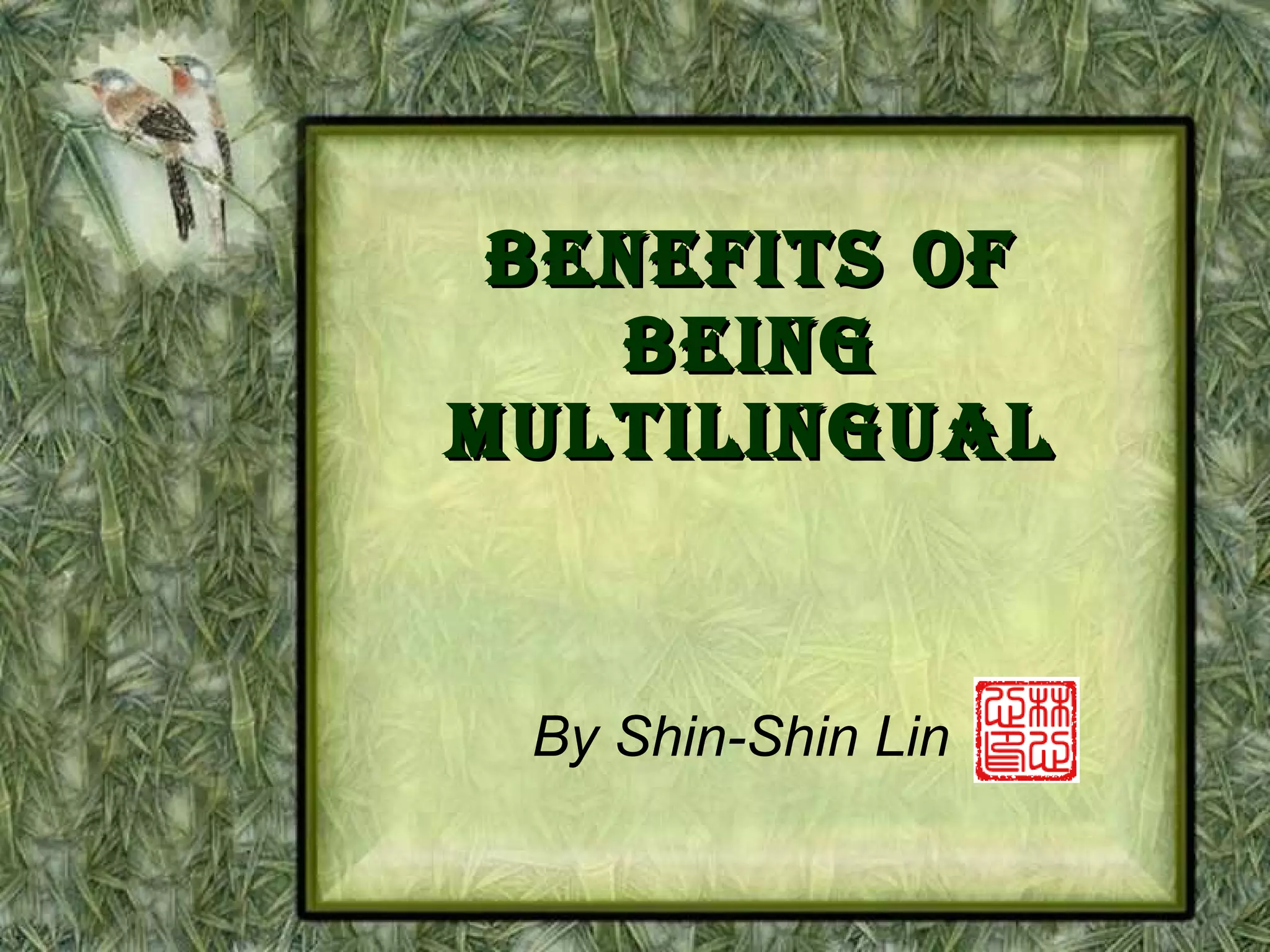 This document discusses the benefits of being multilingual and learning Chinese specifically, including becoming more competitive in business, finding better opportunities, improving communication skills, and experiencing new cultures. It notes that Chinese is one of the fastest growing languages being taught in schools and will likely dominate the internet. Learning Chinese can provide a doorway to understanding Chinese traditions like New Year, Dragon Boat Festival, and Moon Festival.
