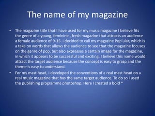The document describes how the media product, a music magazine called "Pop'ular", uses and develops conventions of real music magazines for its target audience of 9-15 year old females. Some conventions it follows include using bright images, bold colors and fonts, and interviews and articles about pop artists. However, it also challenges some conventions by having a slanted title font, limited photos on the cover, and only featuring female models. The layout, contents page, and focus on the pop genre also aim to develop realistic conventions for this target audience.