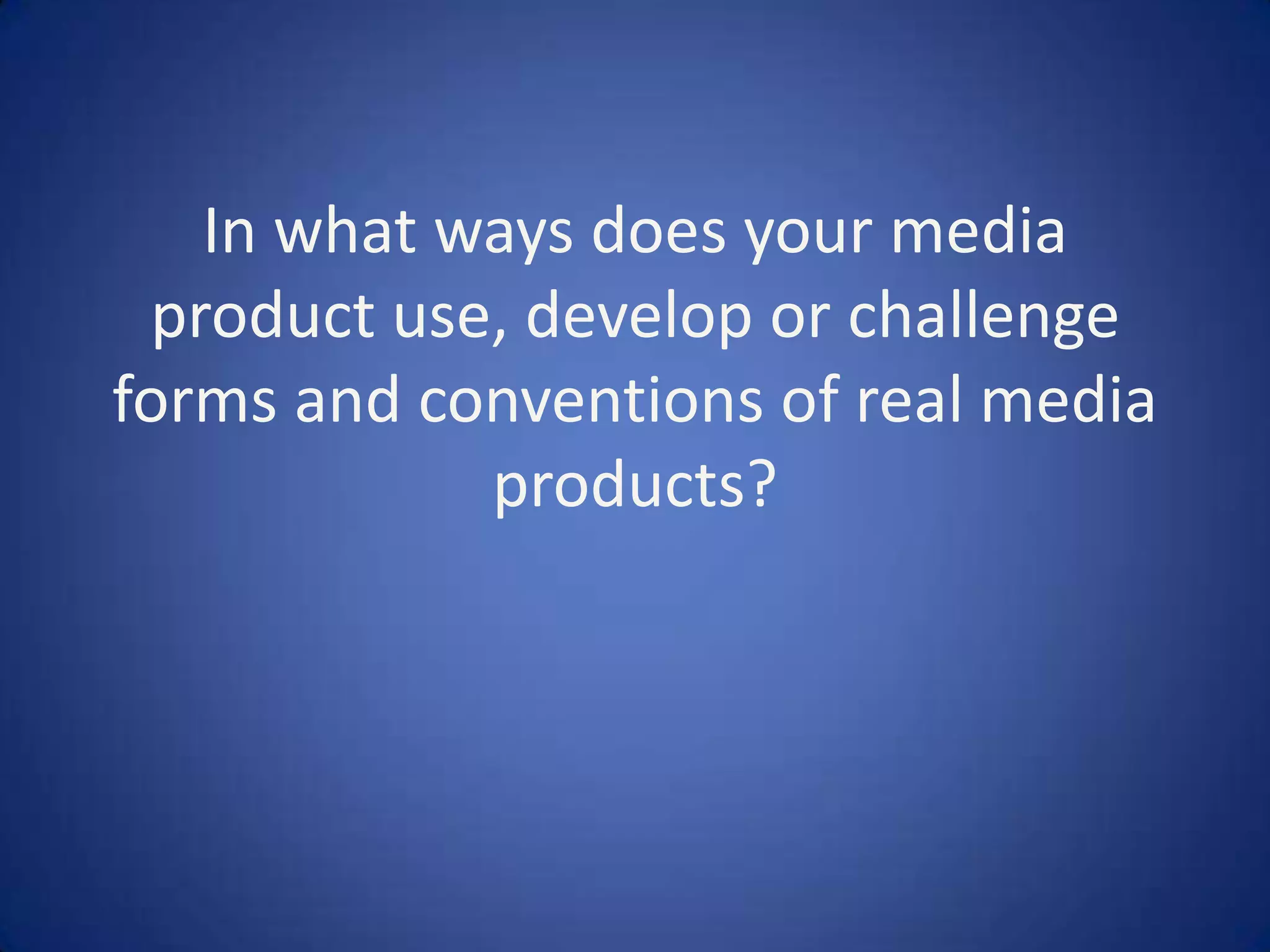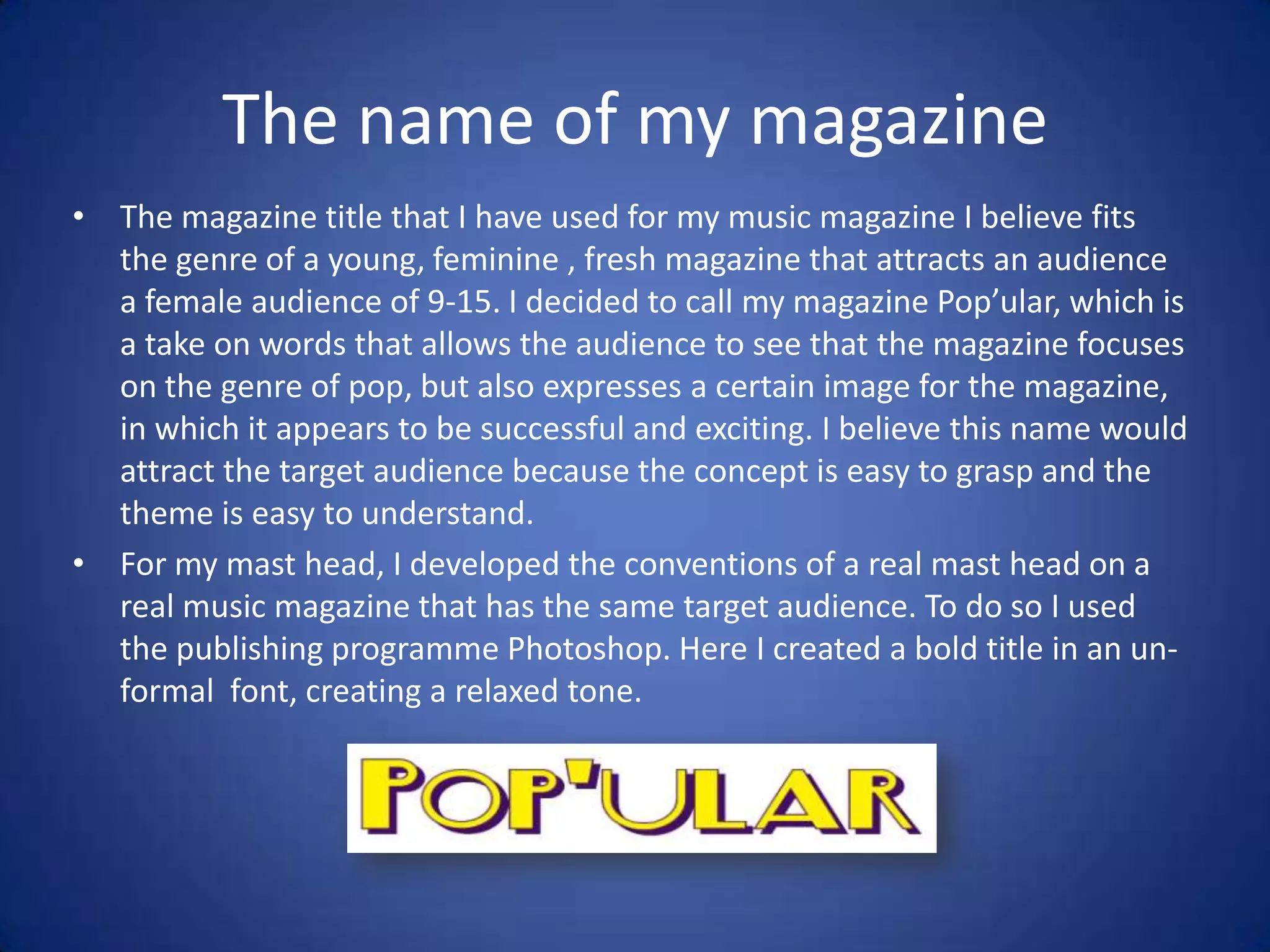 The media product is a magazine called "Pop'ular" that targets teenage girls aged 9-15. The magazine challenges some conventions by using a slanted font for the title and only featuring female models, but otherwise follows conventions. It uses bright images, interviews pop artists, and discusses fashion to attract its target audience. The layout and content sections like interviews and pull quotes mimic a real music magazine. Overall the magazine develops conventions through its focus on pop music genre and young female audience.