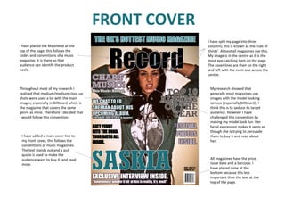 The document discusses how the media product, a music magazine, uses and challenges conventions of real music magazines. It follows many conventions such as including a masthead, rule of thirds layout, cover lines, price and barcode at the bottom. Images use medium/medium close-up shots as seen in Billboard magazine. However, it challenges conventions by having the cover model look fun rather than serious. The contents page includes the masthead and separates pages under headings. Images use medium close-ups or long shots depending on focusing on expression or fashion. A double page spread includes a pull quote and drop capital for the introduction, with a full-page image of the artist that challenges conventions by not looking at the camera.