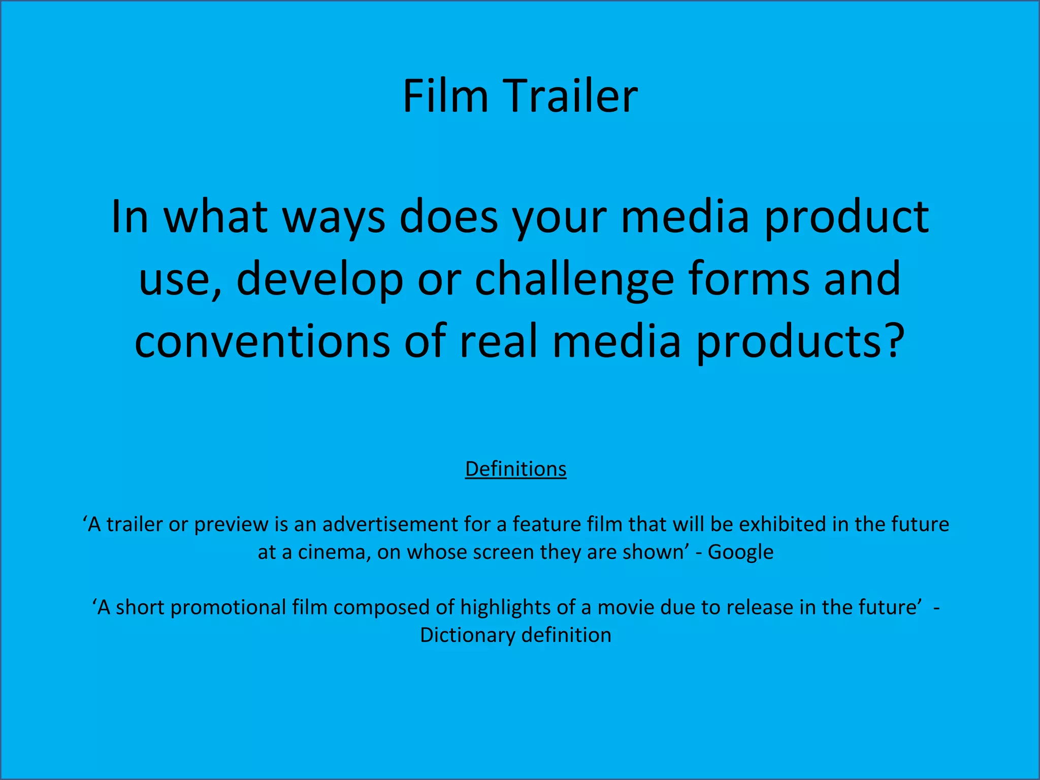 The document provides definitions of film trailers and discusses conventions of real trailers that were researched, including suggesting the storyline through transitions, using attention-grabbing footage, including the film title and date, and introducing main characters. Theories of narrative structure by Tzvetan Todorov and Vladimir Propp that informed the design of the trailer are also summarized. Finally, the document discusses how the student's trailer follows conventions like having a high tempo soundtrack, action-packed scenes, and not fully revealing the storyline, while being unconventional by not including sound effects.