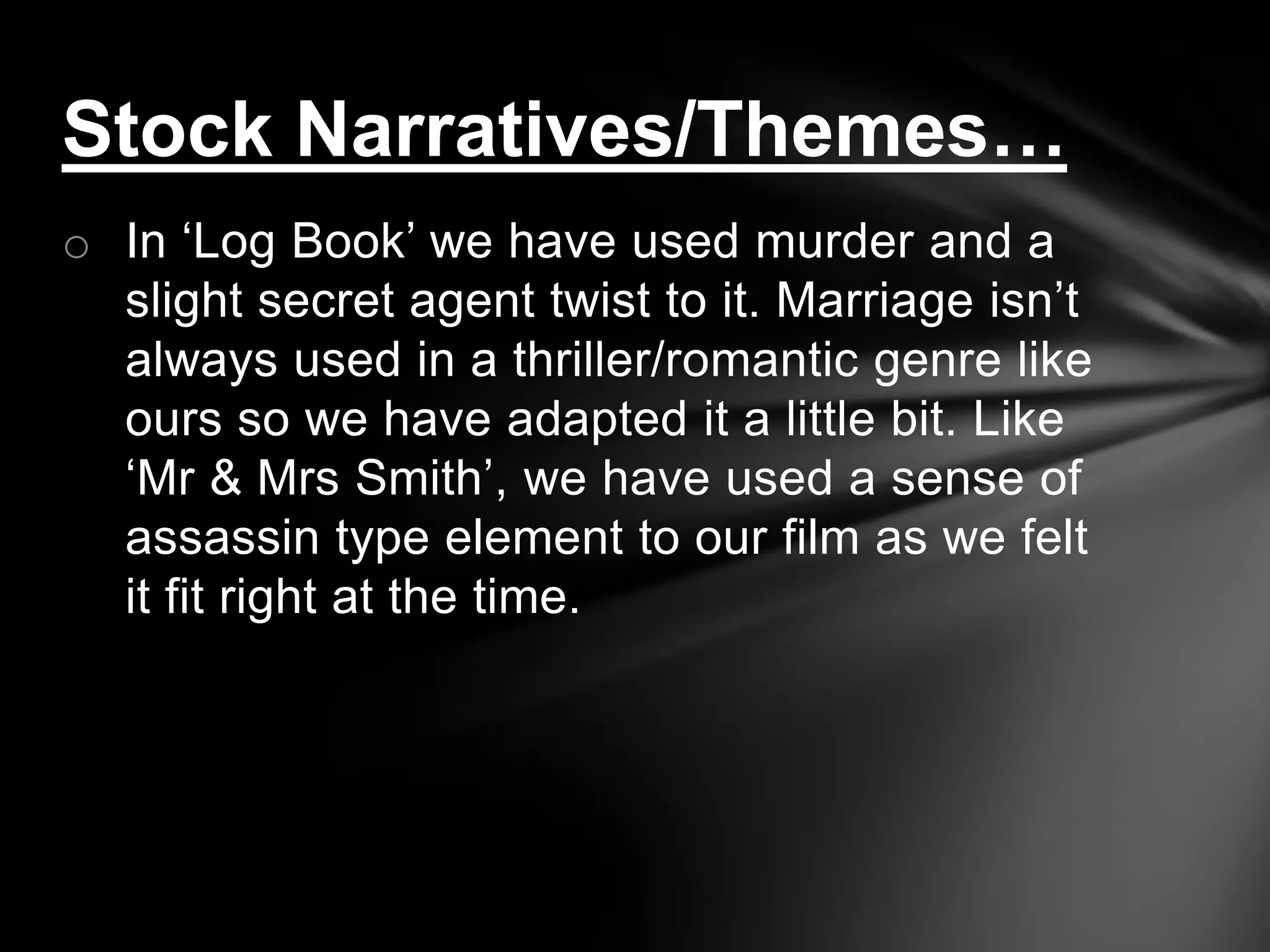 The document summarizes key elements of a film including its narrative themes of marriage and assassins, settings like an office and honeymoon hotel room, characters of a villainous husband and victim, and iconography like wedding rings to indicate a married couple without using weapons to avoid revealing the husband's secret identity as a killer.