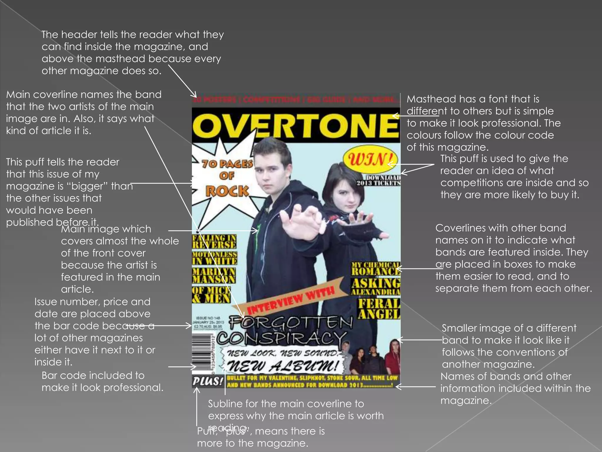 The document provides details on the layout and contents of a music magazine. It includes elements like the cover image featuring an artist, coverlines naming other featured bands, a contents page listing articles by page number, and an interview article example with questions, answers, images and quotes. The goal is to follow magazine conventions to appeal to readers and promote featured artists and contents.