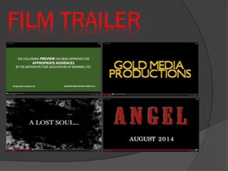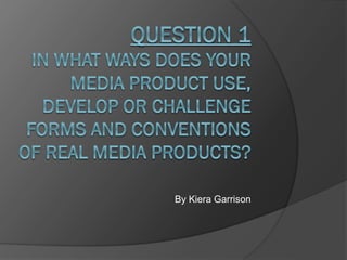 The document discusses the media products created by Kiera Garrison to promote a horror film, including a trailer, poster, and magazine front cover. The trailer aims to portray the main girl as having a dark secret or being possessed by showing her in a graveyard with an evil expression. Conventions like rating cards and production logos were included but not a clear storyline, to generate intrigue. The poster features the film title, information, a long shot of the creepy main girl, and the tagline "looks can be deceiving." Dark colors, lighting, and composition aim to frighten audiences. The magazine cover promotes the film as its main focus, uses colors and other articles to represent the genre, and aims