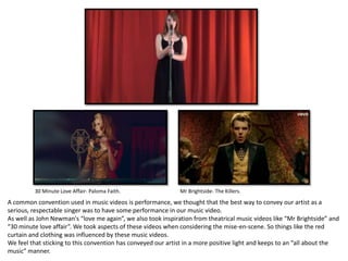 This document discusses the creative decisions made in developing a music video. It describes taking inspiration from other music videos in terms of incorporating performance, using confined car scenes to focus on a couple, and including a narrative to make the song more relatable. Equilibrium theory was also applied to the narrative structure to start with the couple happy, introduce conflict, and resolve it to increase understandability. Inspiration was drawn from other album covers and posters to design promotional materials in a simple, effective way focused on the key information.