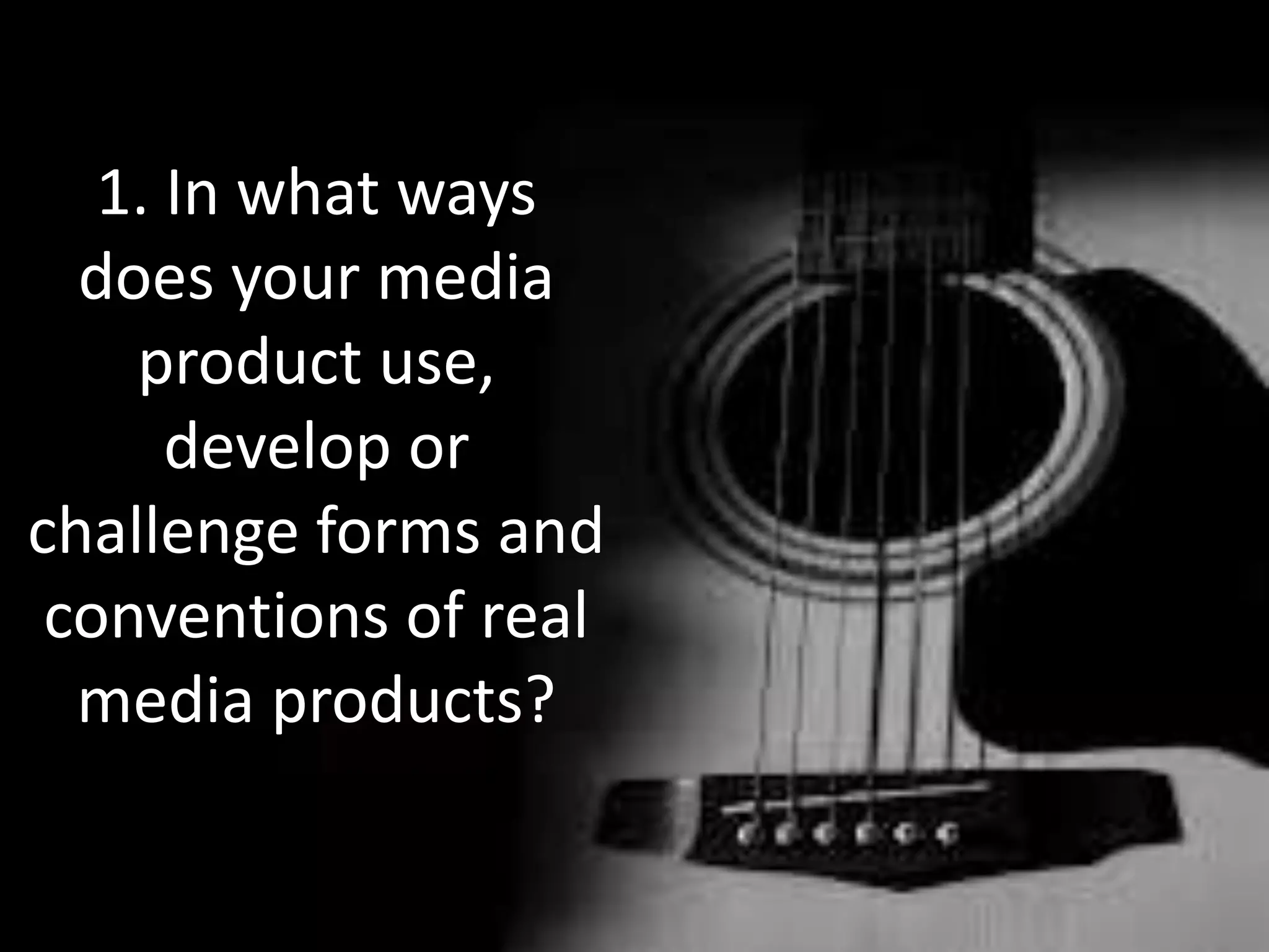 The document discusses how the media product uses conventions of real music videos and products within the indie genre. It summarizes that the music video uses typical conventions like starting with a close-up of the lead singer, using long shots of the full band, and close-ups of instruments to give the impression of a live performance. Outfits, album art, and layout are also typical conventions used across indie albums and videos to establish the band within the genre.