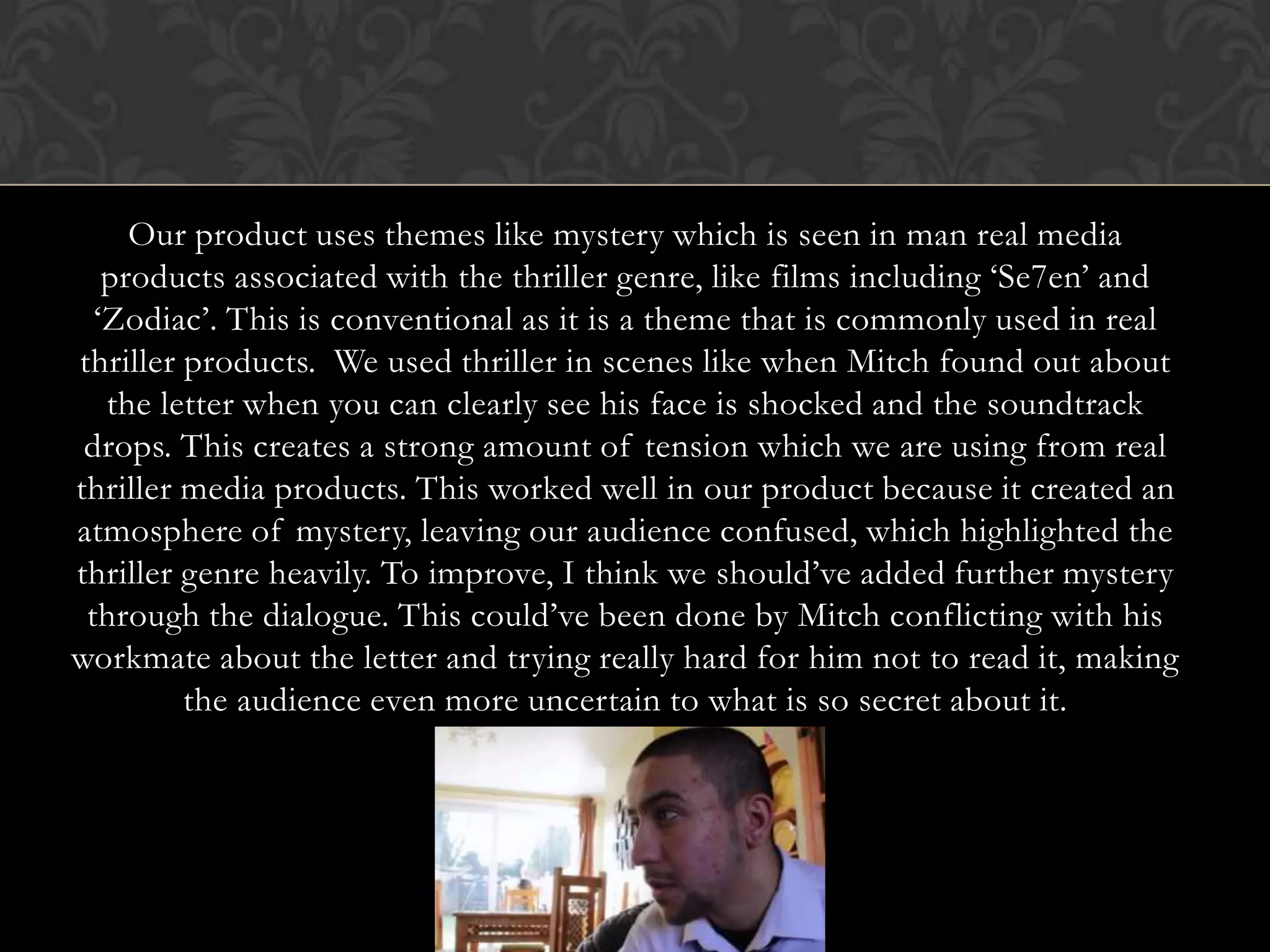 Our media product uses conventions from real thriller films like mystery, tension, and an uncertain narrative to figure out an unknown mystery. We challenge conventions by using non-stereotypical characters like workmates rather than a married couple. Feedback showed the audience was confused by the mystery and recognized the thriller genre. To improve, we could add more mystery through character dialogue or use a more shocking image than a drawing in the letter.