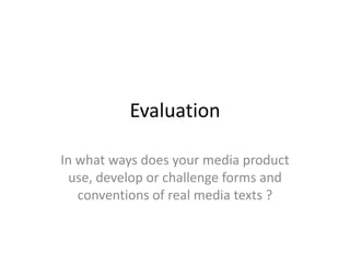 This document evaluates how the media product uses, develops, or challenges conventions of real magazines. It summarizes each section: