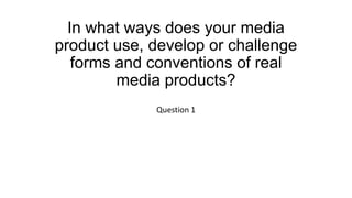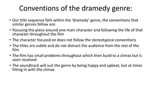 The document discusses how a media product follows conventions of the dramedy genre. It focuses on one main character throughout with characters that challenge stereotypes. Small problems build to a climax and are resolved. The soundtrack is happy but also fits dramatic moments. Love Actually and Juno are examples that conform to these conventions. The media product also focuses on two non-stereotypical "hipster" characters that meet unexpectedly, and includes minimal dialogue to advance the plot subtly without distraction. The music is upbeat but relaxed, and titles are subtle but noticeable, conforming to dramedy conventions.