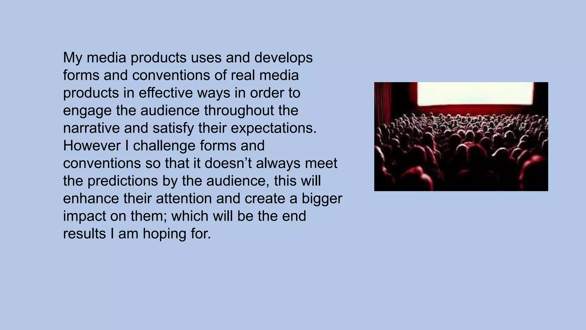 The document discusses how the creator used conventions from real media products like "Gone Goodbye" and "Moments" to create their own short film. Some conventions that were used include close-ups of the protagonist's face to develop sympathy, long shot durations to build tension, and voiceovers to make the story personal. The location and music were also chosen deliberately based on conventions. Some conventions were challenged, such as implying the protagonist was not innocent and having only negative scenes with no happy memories. The creator believes their use of conventions helped engage the audience as intended.