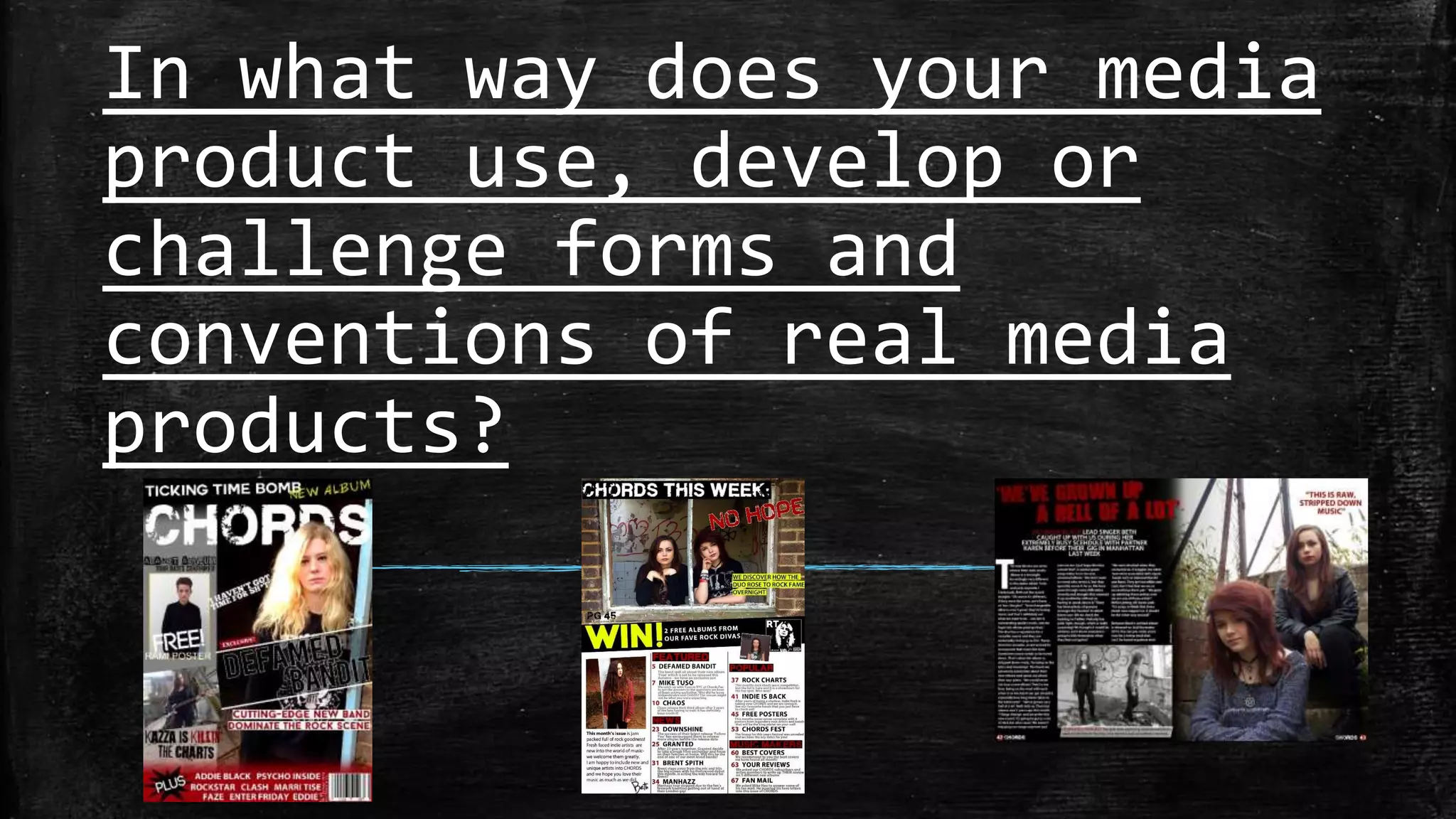 The document discusses the conventions used in the design of a mock rock music magazine cover and contents. It summarizes how elements like the masthead, cover lines, images, layout, typography, and language employ conventions of existing rock magazines like Kerrang and NME while also breaking some conventions. For example, the placement and styling of the masthead, use of sans-serif fonts, rule of thirds layout, and informal language are all conventional, though some images introduce unconventional backgrounds and the banner includes a cover line rather than artist names. Overall, the magazine draws from real conventions but also challenges some expectations.