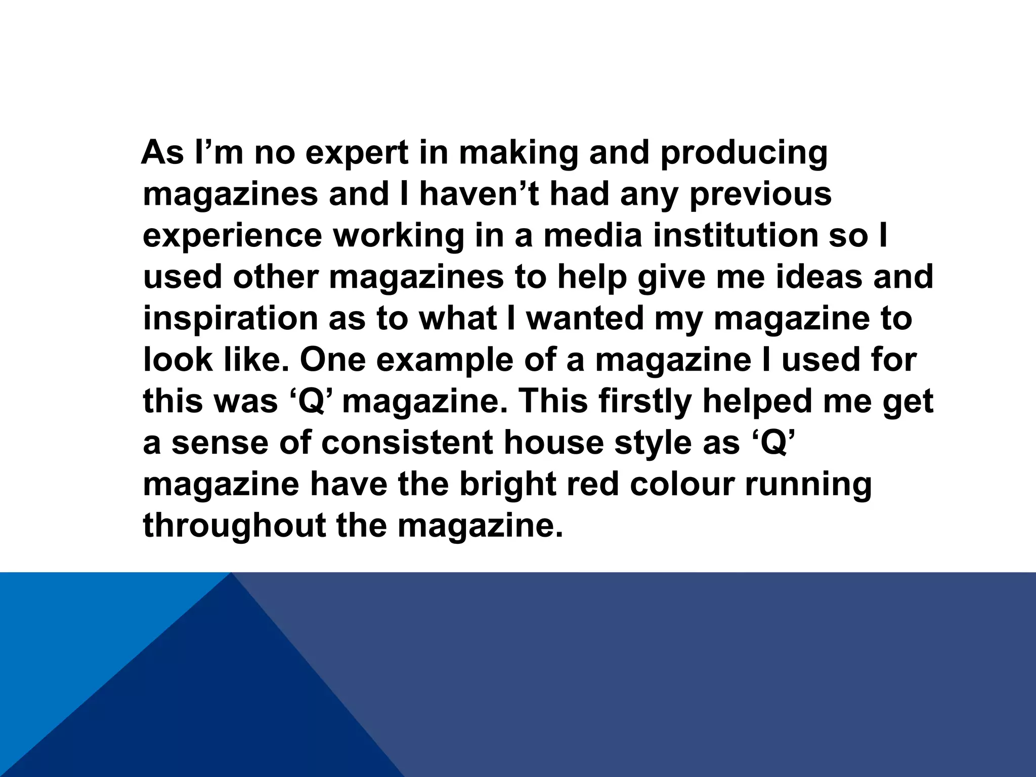 The document discusses the author's approach to creating a music magazine inspired by other publications, particularly 'Q' and 'Miss Vogue.' The author emphasizes the importance of house style and layout, taking elements from these magazines while striving for originality to better appeal to their target audience. Ultimately, the author aimed to create a unique contents page by blending inspiration with their own design ideas.