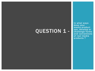 This document discusses how the media product uses and challenges conventions of real films. It summarizes key elements of the film's title, opening scene, costume, special effects, and location. The opening scene introduces a disoriented protagonist through an extreme close-up of her eyes. Her costume is plain to avoid stereotypes and suggest she has gotten into trouble. Limited special effects are used to further disorient the viewer. The secretive forest location conforms to conventions from films like The Hunger Games and E.T.