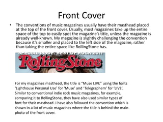 This document discusses how the media product, a music magazine called "Muse LIVE", uses and challenges conventions of real music magazines.