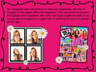 This document discusses how a magazine product uses conventions of popular magazines to target young girls as its audience. It uses many images and bright colors like pink, blue, yellow, and green on its pages. While pink is a typical color, the magazine includes a variety of bright colors to seem less feminine and avoid stereotypes. The magazine also uses informal language, slang, abbreviations and colloquialisms commonly found in popular magazines to make readers feel comfortable. Important conventions like puffs, plugs and buzzwords that engage readers are also used on cover lines and stories.