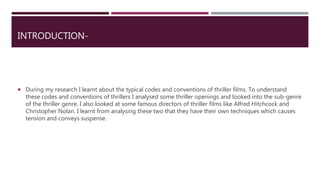 The document outlines the production techniques used in creating a thriller film, focusing on the application and subversion of traditional thriller conventions such as sound, lighting, character portrayal, mise en scene, and editing. The creator analyzed famous directors and films, implementing suspenseful sound design, dark lighting, and an unusual character dynamic between a victim and a killer. By challenging typical conventions, such as the editing pace and character roles, the thriller aims to engage the audience with a unique narrative approach.