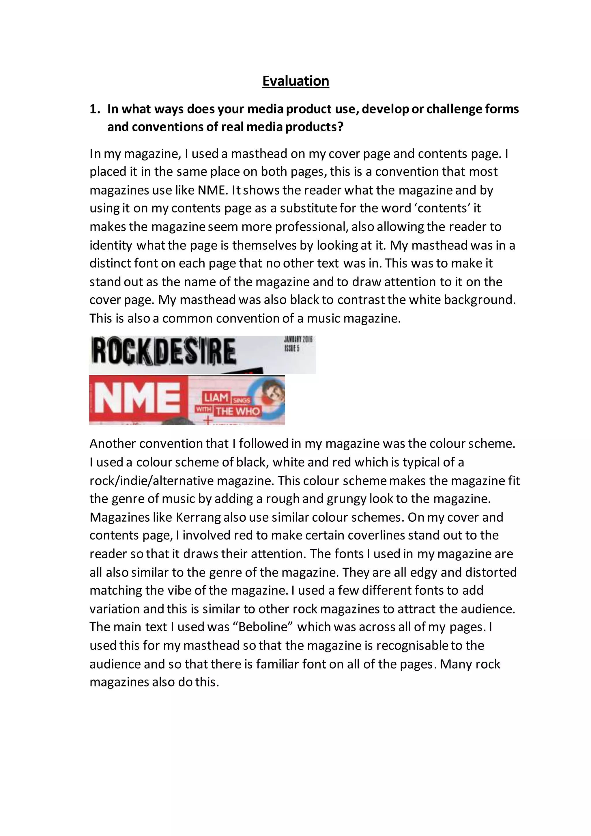 3. The fonts mimic those of the genre to attract the target audience, and the main text font is used consistently throughout for familiarity, as seen in many rock magazines.