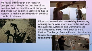1. The document discusses the filmmakers' process in developing the opening scene of their thriller film to engage audiences. They aimed to include exciting, memorable conventions like unexpected events early on that were inspired by successful films.