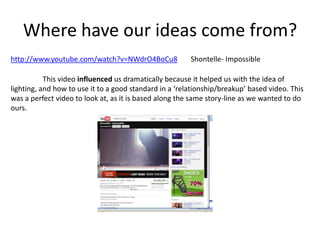This document discusses how the student's music video project was influenced by real music videos they viewed online. It summarizes how they took ideas from Shontelle's "Impossible" video for lighting and using a relationship storyline. They also drew on flashback techniques from Rihanna videos. The student aimed to follow conventions like close-ups and slow motion shots that make music videos feel professional. While not completely original, they brought their own style through the performer and tried to balance familiar elements with some new creative risks. Audience research helped shape the project to appeal to viewers expecting typical music video tropes.