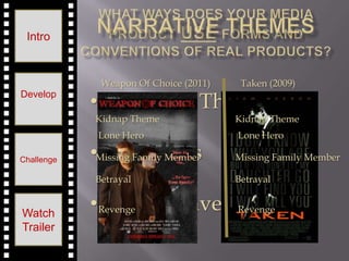 The document discusses the crime thriller film "Weapon of Choice" and how it develops and challenges some common crime thriller conventions and themes. It analyzes how the film features a betrayal theme similar to "Taken" but explores a closer betrayal. It also notes how the main character challenges conventions by being younger and more ordinary than typical crime thriller heroes. The film aims to have audiences better connect with this untraditional hero.