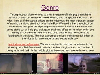 The document discusses conventions used in a student music video project based on Andrew Goodwin's seven conventions for music videos. It describes how the video incorporated conventions of genre, star identification, voyeurism, lyrics and visuals, and locations to tell the story of two lovers. It also discusses challenges to conventions like not including inter-textual references or following all conventions. Inspiration was drawn from music videos by Lana Del Rey, Florence and the Machine, and Ed Sheeran that also challenged conventions.
