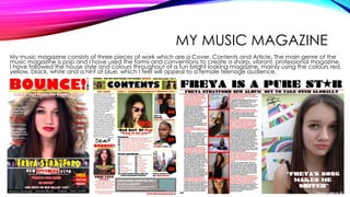 The document summarizes how the student's media product of a music magazine uses and develops conventions of real music magazines. The magazine includes a cover, contents page, and article that follow standard structures and designs. The cover includes elements like the masthead, selling line, cover lines, main image of the artist, and pull quotes. The contents page lists the features, artists, and main story. The article focuses on the main artist through a question and answer format, with images and pull quotes. Overall, the student aimed to create a magazine that would appeal to teenage girls through its bright, fun style while adhering to common magazine conventions.