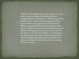 This document discusses a student's work on creating a film trailer, poster, and magazine cover for a media coursework assignment. The student chose the thriller genre and developed ideas for their project. For the magazine cover, they included cover lines and used different fonts and a red, white, and black color scheme. The poster included a billing block with cast and crew information, and also used a simple red-focused color scheme. In filming the trailer, the student considered various shot types and carefully edited makeup, costumes, and props to achieve a horror feel. The student believes their trailer, poster, and magazine cover are effectively linked through their common use of the same actress, the color red, and consistency in style and genre elements.