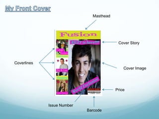 This document analyzes how a student media product uses, develops, and challenges conventions of real media products. It provides examples of several conventions used: mastheads, cover images, coverlines, issue numbers, barcodes, headlines, images, page numbers, subtitles/captions, standfirsts, pull quotes, and bylines. The student developed some conventions by making elements bigger, using different fonts/layouts, and challenging conventions like separating cover stories, using close-up images, and including biographies instead of interviews. The analysis compares the student product to Top of the Pops magazine.