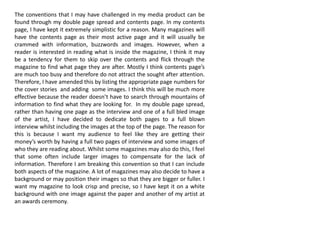 The document discusses the conventions used and challenged in a media magazine product. It summarizes that the magazine mostly conforms to conventions seen in other magazines through its layout, masthead positioning, use of coverlines and consistent camera shots of models making eye contact. However, some conventions are challenged through a simplified contents page that lists only key pages rather than being overly busy, and a double page spread that dedicates both pages to a full interview alongside images rather than splitting content across pages. The goal is to provide the reader with a crisp, easy to navigate product that still includes important information.