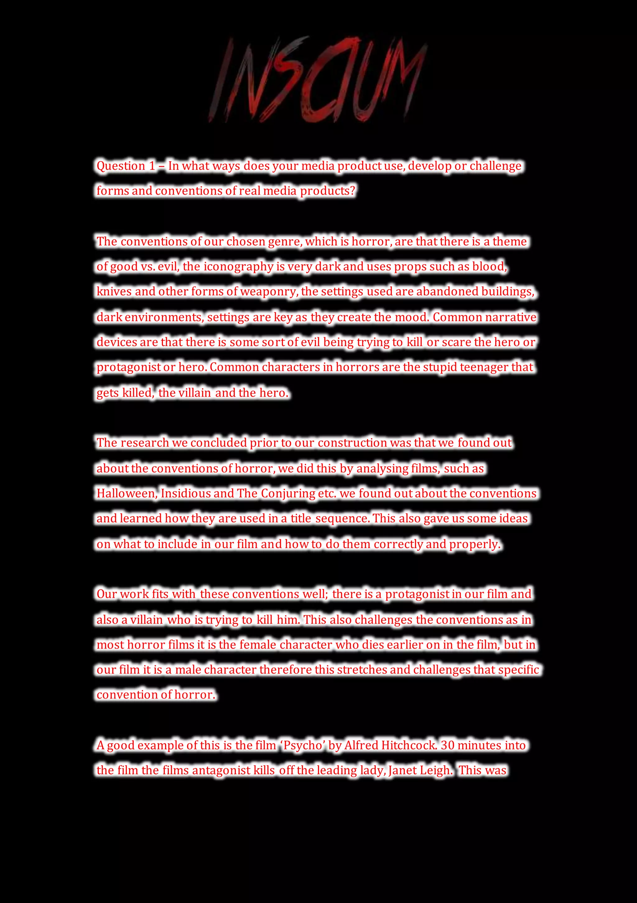 The document discusses the conventions of horror films that the media product draws from and challenges. It notes that common conventions include themes of good vs evil, dark iconography and settings, and an evil figure threatening the protagonist. The creators analyzed horror films to understand these conventions and apply them appropriately. While their work fits many conventions, like including a protagonist and villain, it challenges one by having the male character die early rather than the female, as often happens. They aimed to break conventions like the film Psycho did by unexpectedly killing off the leading lady early.