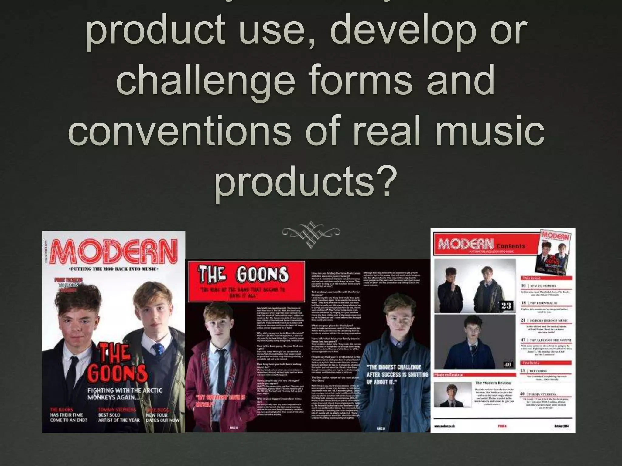The document discusses the key components of a magazine cover and interior pages, including the front cover, contents page, and article page. It provides details on the main photo, masthead, headlines, and coverlines that make up the front cover. For the contents page, it describes the features column, use of pictures and colors. Finally, it explains the title, images, quotes and multi-column format used for the article page. The document serves as an example to follow for layout and design of a music magazine.
