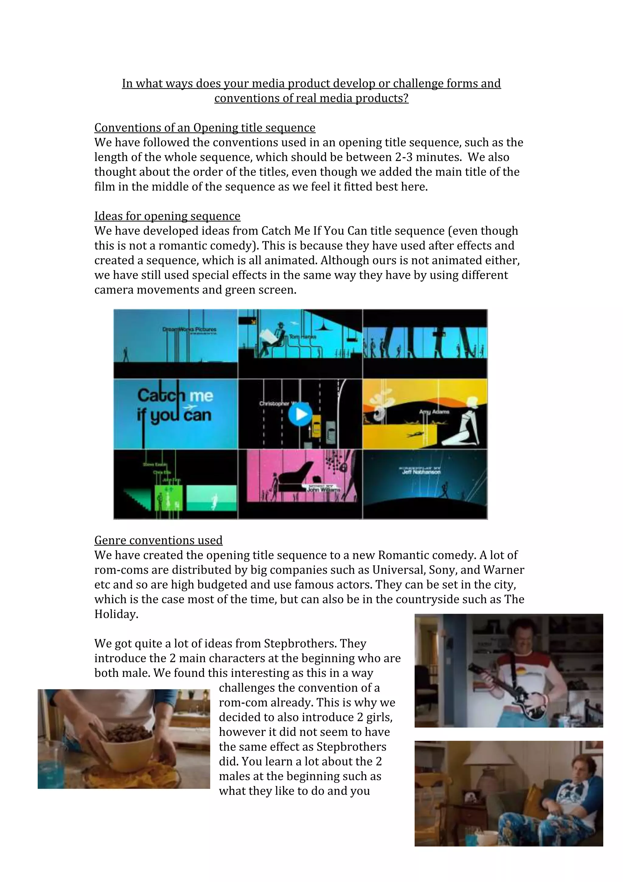 The document discusses how the opening title sequence for a romantic comedy film challenges some conventions of the genre while still following others: