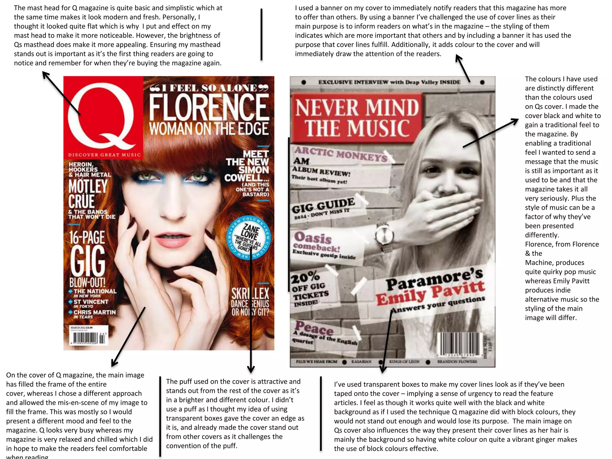 The document compares and contrasts the design choices made for the cover and interior pages of Q magazine versus those made for the student's own magazine concept. The student aimed to challenge conventions and present a different mood compared to Q magazine, which they described as "very busy" versus their own magazine, which was meant to feel "very relaxed and chilled." Across multiple pages and sections, the student considered choices made by Q magazine and other similar magazines, taking some conventions and developing their own adaptations and new ideas for their magazine concept.