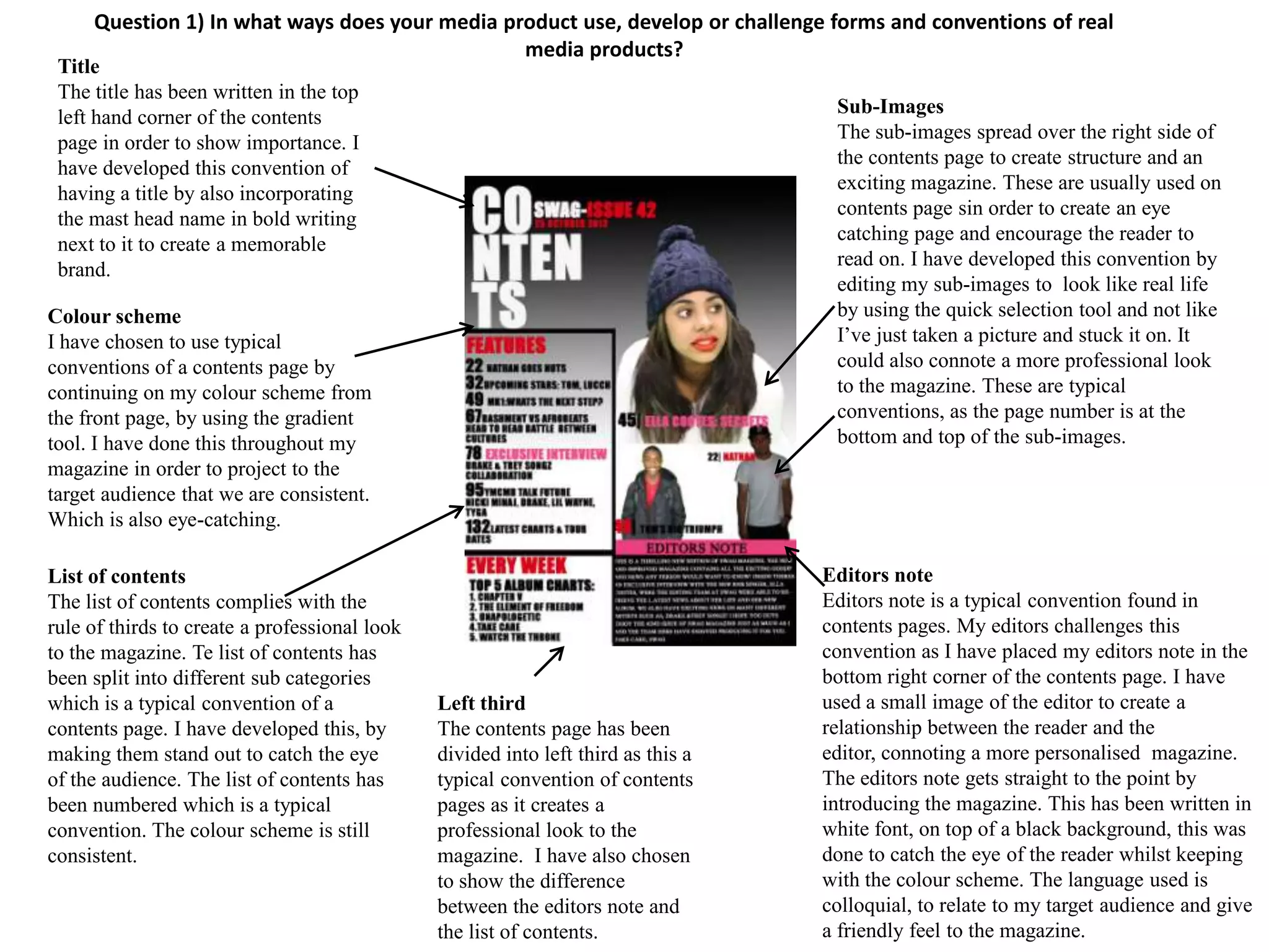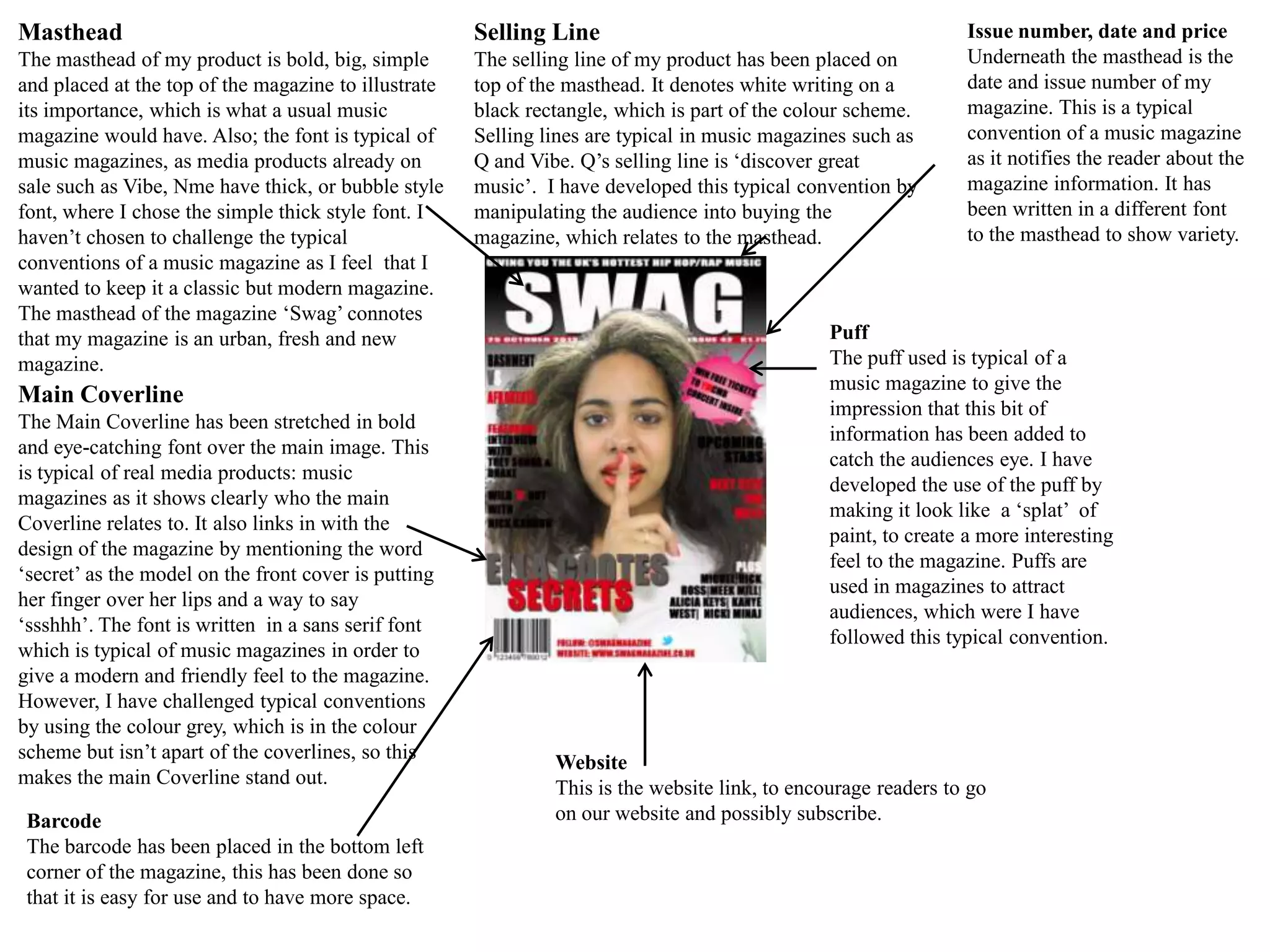 The media product uses, develops, and challenges some conventions of real music magazines. It uses typical conventions like placing the masthead, selling line, issue details, and barcode in standard locations. However, it develops conventions by using unique fonts, colors, and layouts. It also challenges conventions by placing some elements like the editor's note and main coverline in non-typical locations or styles. Overall, the goal is to create a modern feel while still following recognized magazine conventions.