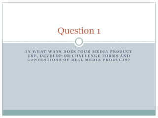 The document discusses conventions of magazine front covers and contents pages. It provides examples of a music magazine cover and contents page that serve as templates. It then shows the student's preliminary front cover, contents page, and double page article spread and discusses how they follow or challenge conventions of real music magazines. The student works to incorporate conventions like prominent mastheads, cover lines, consistent color schemes, and representative photos, while also adding their own style. Spacing remains an issue to work on.