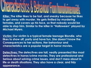 Our media product uses common conventions of horror and crime genres. It introduces the main characters - a typical "dumb blonde" victim, a mysterious killer resembling Michael Myers, and professionally-dressed detectives. The opening sequence shows the victim waking alone at night, seeing strange movements in the woods, and being chased and attacked by the killer. Detectives then search for clues about the victim's fate. Common horror themes of violence, crime, murder and mystery are explored through realistic settings, costumes, lighting and a suspenseful narrative structure and soundtrack.
