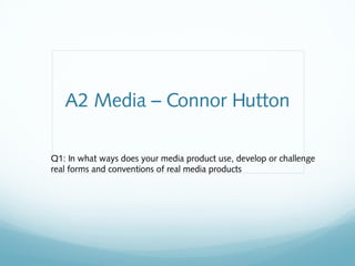 This document discusses how the media producer's music video, album packaging, and magazine advertisement utilize and develop conventions of those media forms within the R&B genre. The music video incorporates conventions such as a romantic narrative, costume changes, location variations, and lip syncing. The digipak features the artist image, tracklist, and social media links. The magazine ad focuses on promoting the artist image, album details, and release date using stylistic conventions.
