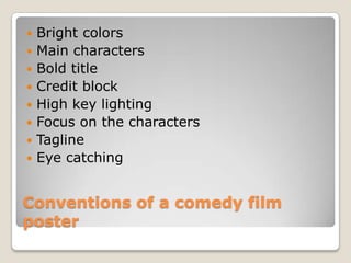 The document discusses conventions of comedy film posters such as bright colors, main characters, bold titles, credit blocks, high key lighting, focus on characters, and eye-catching taglines. It then describes the development of the poster for Aneeka Ishaq's media product, which features a bold title in the color scheme of a cupcake, main characters with comedic facial expressions, a credit block and logo, and a tagline on a white background. Feedback was incorporated from an initial version to focus the poster's comedic elements and story.
