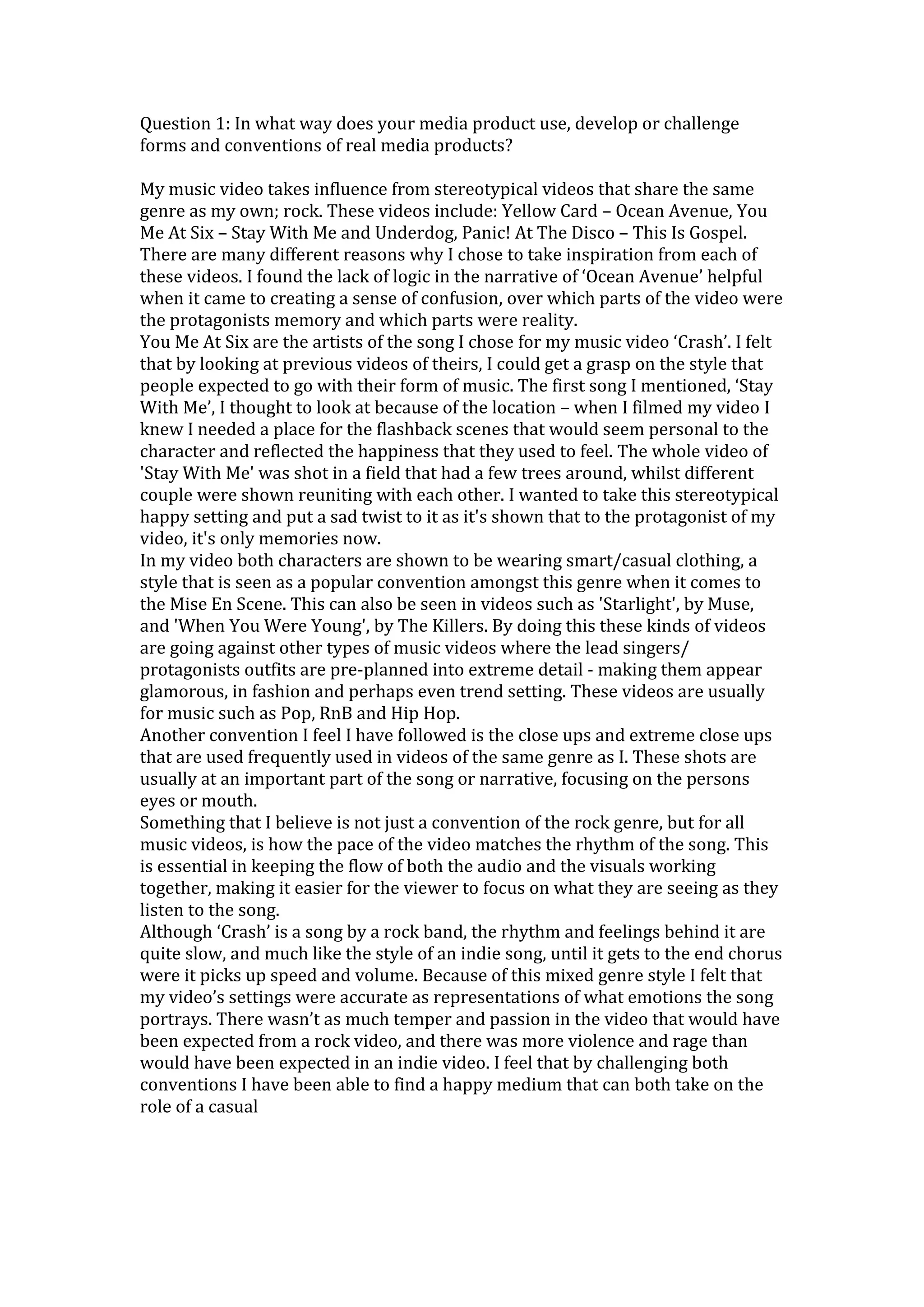The document discusses how the media producer's music video takes influence from conventions of the rock music genre. It draws inspiration from videos by Yellowcard, You Me at Six, and Panic! At the Disco in terms of narrative style and setting. It also follows conventions like matching the video's pace to the song's rhythm and featuring close-ups during important parts of the song. However, it challenges genre conventions by having a slower, more emotional style that mixes elements of rock and indie music.