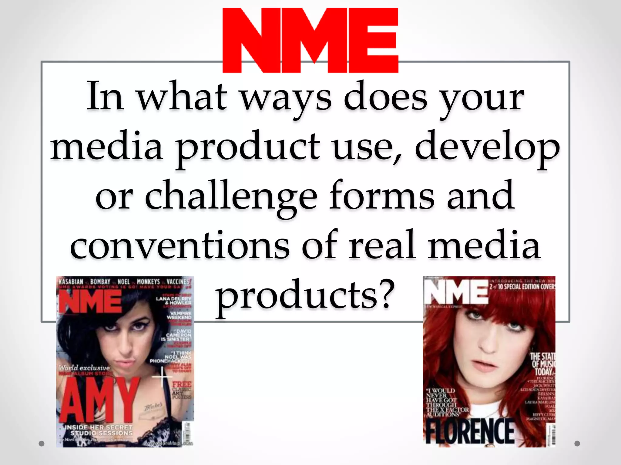 The document summarizes how the media product adheres to and challenges conventions of real indie/rock music magazines. It discusses conventions related to design elements, typical content, portrayal of artists, and ownership models. The product aims to stick closely to conventions like using bright colors and featuring band information prominently while challenging conventions such as having a more minimal front cover and portraying a diverse band. The evaluation identifies some areas that could be improved like centering a title and perfecting layout details.