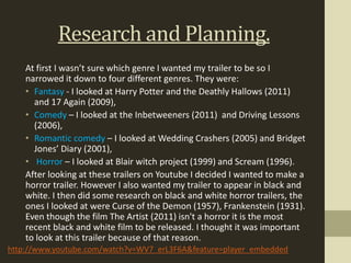 The document discusses the planning and research done for a black and white horror film trailer. It looked at conventions from horror trailers such as Scream, Frankenstein, and Curse of the Demon. Key points included: choosing a horror genre with no dialogue; using music throughout; including a voiceover at the beginning and end; choosing a dramatic font for the title; and incorporating shots like close-ups and over-the-shoulder shots common to horror trailers. Storyboards and character descriptions were used to plan scenes and aid the actor's performance. The location from Scream was developed to make the character vulnerable.