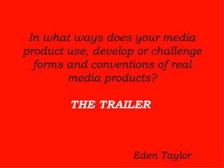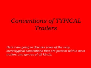 The document discusses conventions used in movie trailers that the author took inspiration from for their own animated comedy trailer project. These include using a school bell at the start to indicate the school setting, introducing characters through animated titles or profiles, and juxtaposing dialogue to form fake conversations for comedic effect. The author analyzed trailers for films like Mean Girls, Angus Thongs and Perfect Snogging, Step Brothers, and Diary of a Wimpy Kid to find techniques to incorporate into their trailer.