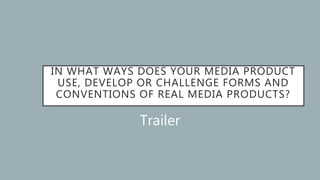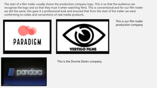 Our film trailer uses and develops conventions of real media trailers. We include the production company logo at the start to establish trust, as is conventional. Throughout the trailer, we use intertitles to provide further narrative information, with white text on a black background as is typical. We place the film title "Deluded Elude" at the end to allow audiences to remember it, following convention. The billing block with credits for directors, actors, and crew is also included at the end, mirroring real media trailers. Overall, our trailer adheres to codes and conventions through these inclusion of these essential elements.