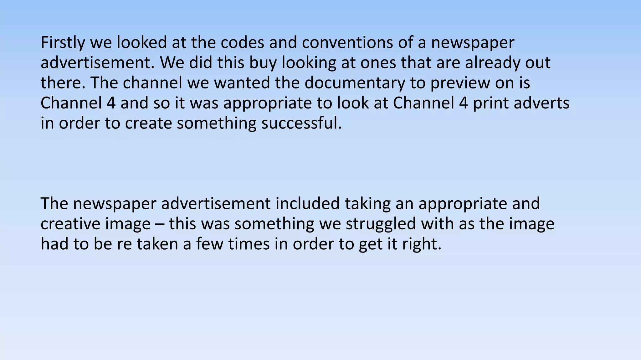 The document discusses the codes and conventions followed in creating a newspaper advertisement for a documentary. It describes taking an appropriate image of the swimmer interviewed that incorporated multiple sports elements. The main conventions included displaying the documentary title clearly using a Channel 4 style font, incorporating the white Channel 4 logo, and including the air time of 8:30pm as the schedule information. The slogan "raising the bar" was placed under the title in the next largest font size.