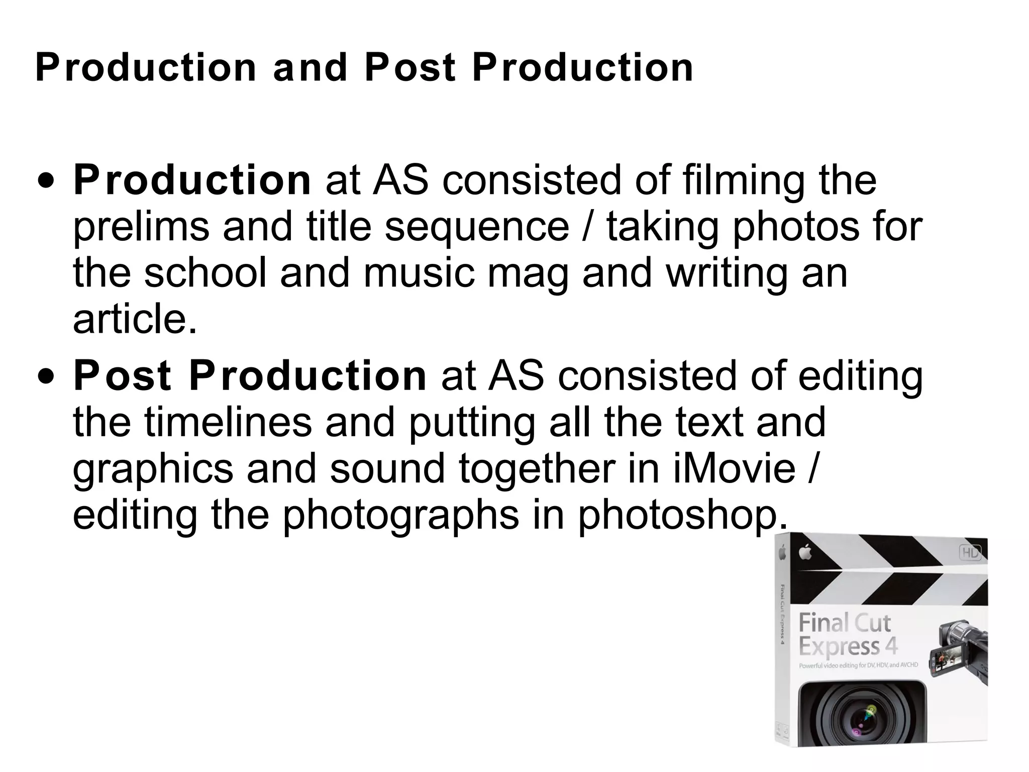 The document discusses the stages of post-production for various media projects completed in AS and A2 levels. It details using tools like iMovie, Photoshop, and Vegas to edit video footage, audio, and photographs. The document prompts analyzing the progression of skills from AS to A2, specifically regarding editing footage in iMovie and using Photoshop. It asks to link post-production choices to key media concepts and identify connections between areas like digital technology, representation, and audiences in the development of skills.